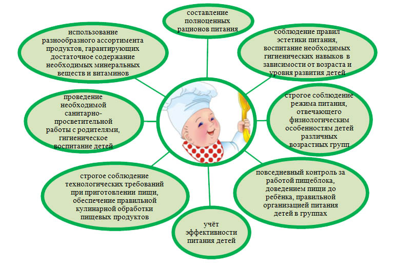 Правильное питание в ДОУ достигается путем соблюдения следующих принципов: